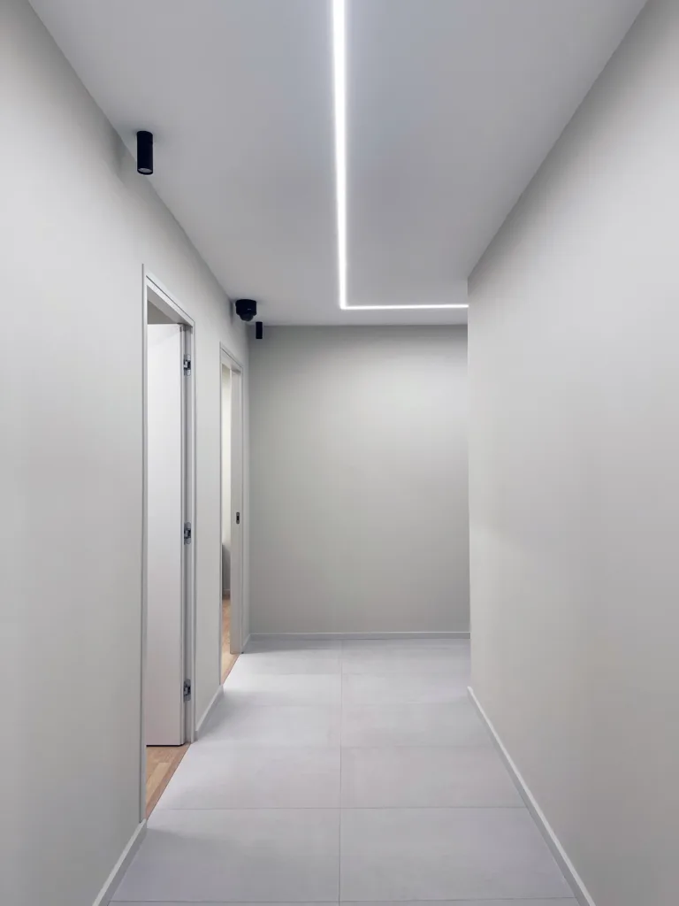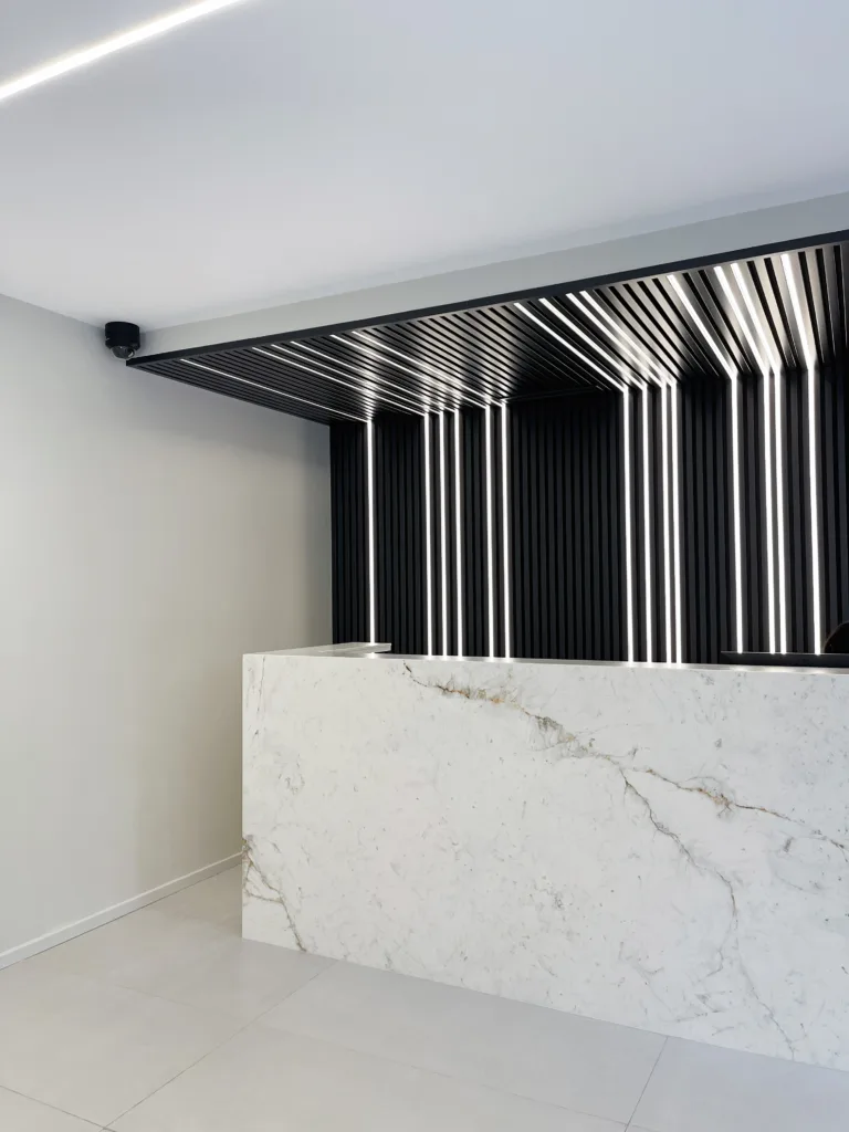 The inclusion of a sleek marble reception counter, in conjunction with the minimalist design elements and meticulous lighting selections, culminates in a cohesive and inviting atmosphere. It sets the tone for the overall experience and reinforces the clinic's commitment to providing a high-end and luxurious environment.